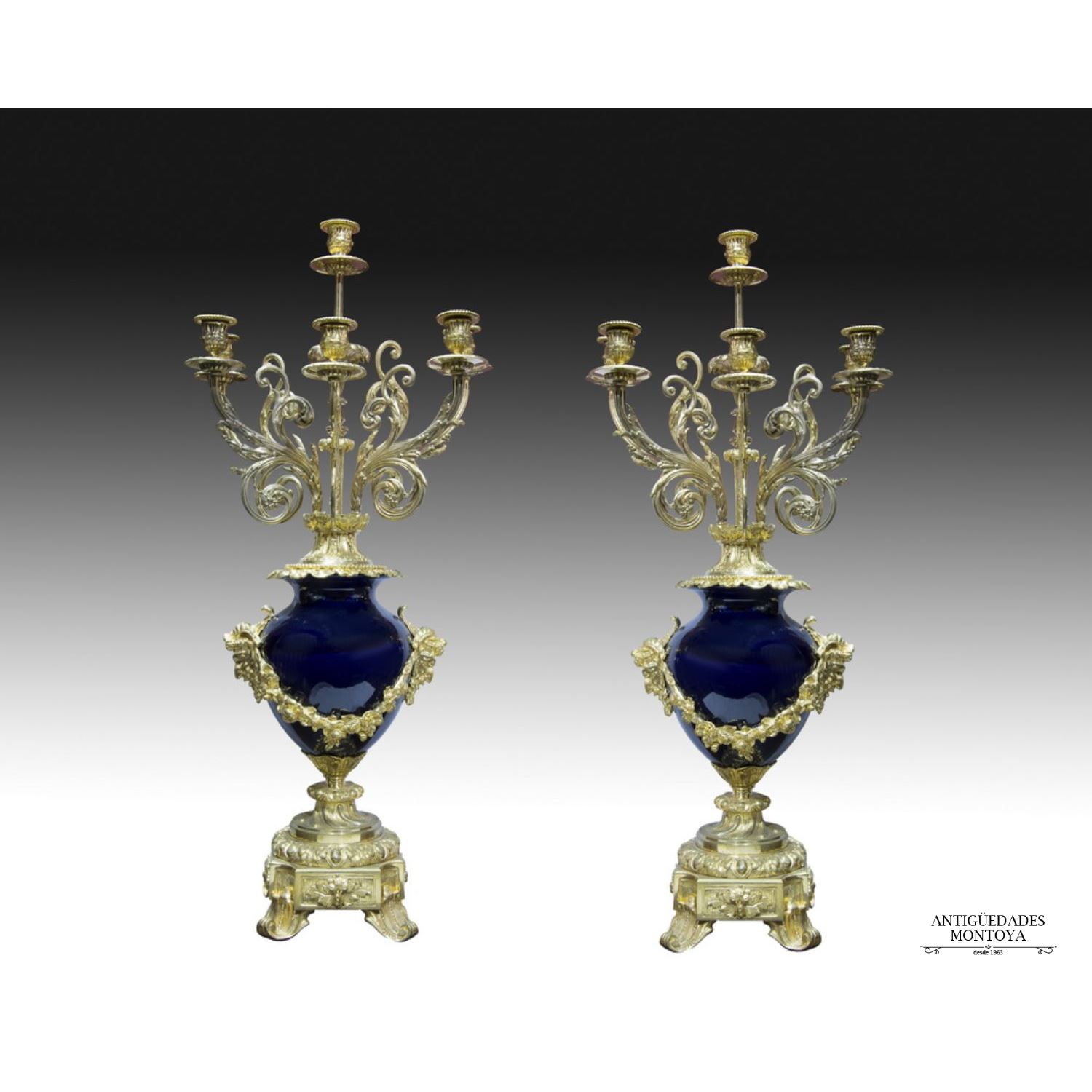 Realizados en bronce dorado y cuerpo de porcelana esmaltada en azul cobalto. Presentan forma de jarrón con luces a modo de flores. Decorados con guirnalda flanqueada por mascarones. Medidas: 83 x 36 cm.