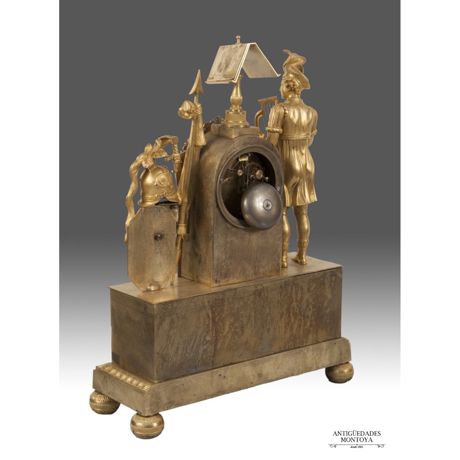 Realizado en bronce dorado al oro fino. Presenta plinto rectangular con escena en bajorelieve. Se remata con caja de reloj con figura tocando el arpa a un lado, y escudo, yelmo y armas al otro. Maquinaria París.Sonería de horas y medias. Medidas: 47 x 34 cm.