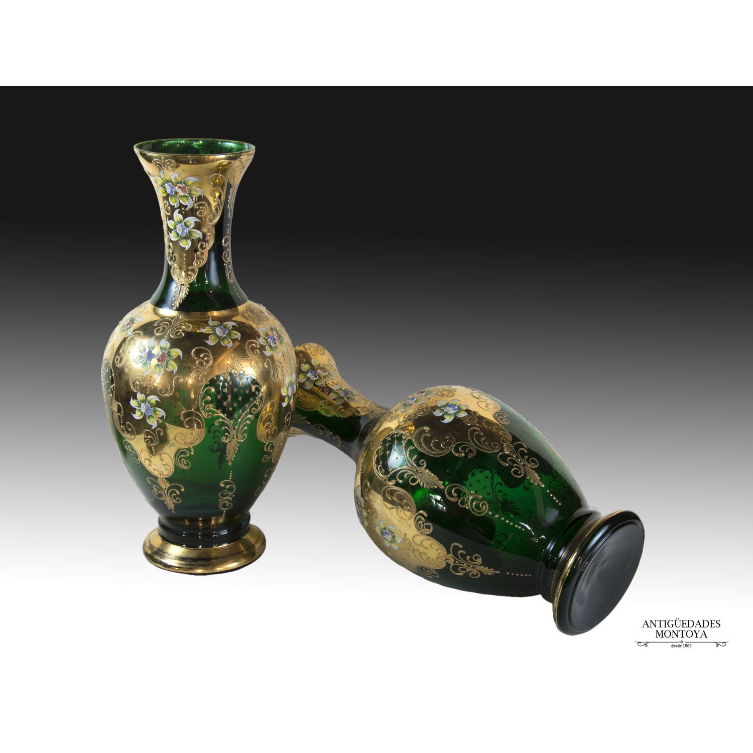 Pareja de jarrones decorados a mano con pinturas y oro fino.